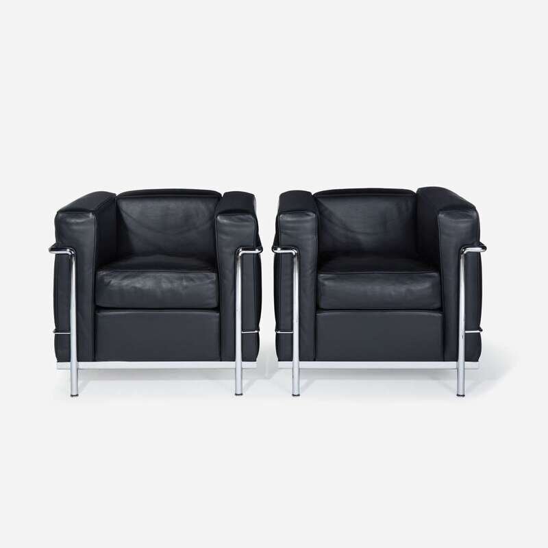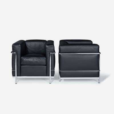 Le Corbusier, Pierre Jeanneret, and Charlotte Perriand Pair of LC2 Fauteuils Grand Confort, Petite Modèle, Cassina, Italy, designed 1928, the present lot early 21st century