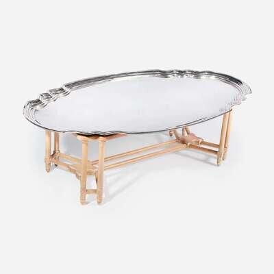 Carved and stained wood base, removable nickel plated brass tray