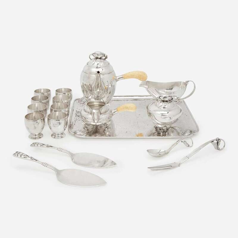 Comprising a four-piece coffee service in the "Blossom" pattern: including a coffeepot, a covered sugar, a creamer, and a rectangular tray, all bearing marks for post-1945 production; a set of eight egg cups, bearing marks for 1925-1932 production; a footed sauceboat bearing mark for 1925-1932 production; and four serving utensils including a pair of cake knives / slices, a two-pronged fork, and a small ladle, all bearing marks for 1915-1932 production. (17 pieces total)