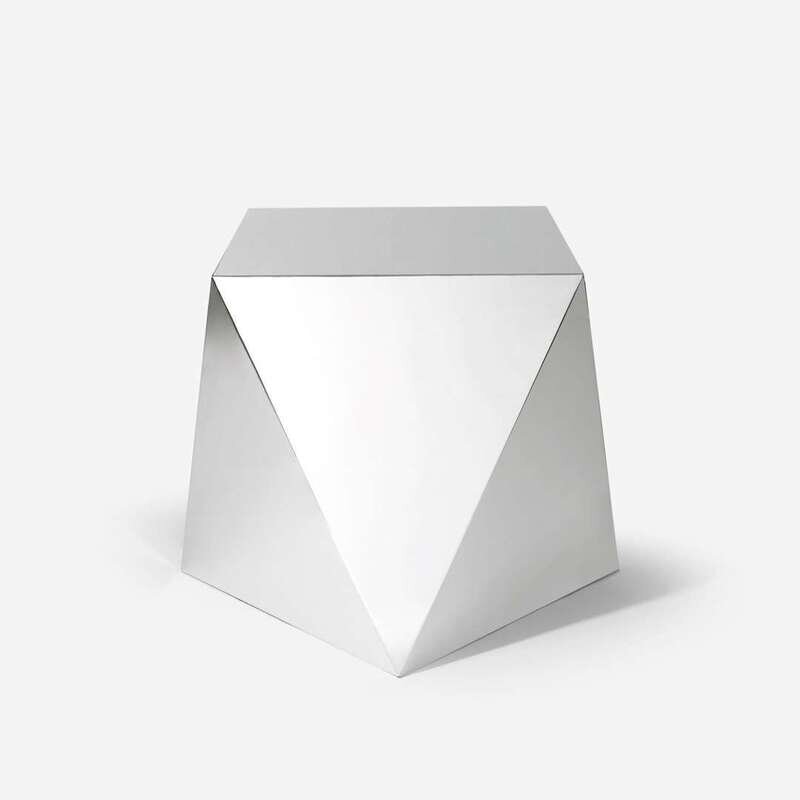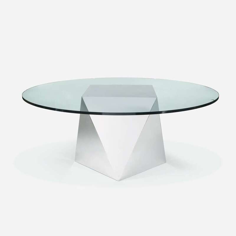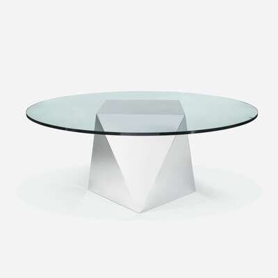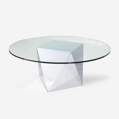 Chromed steel geometric base on leveling feet, round tempered glass top