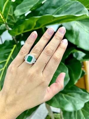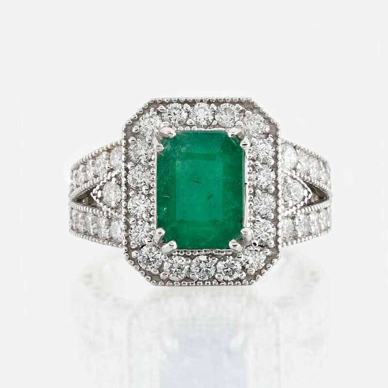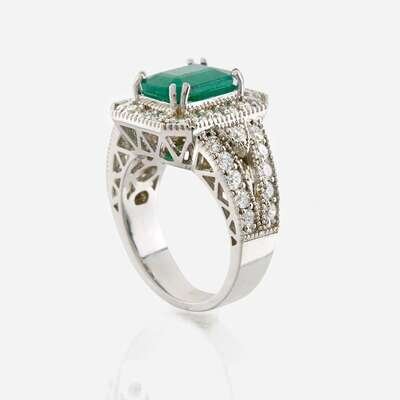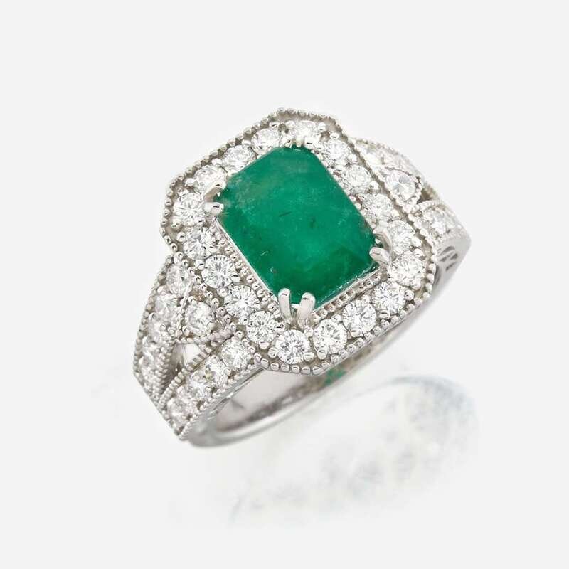 centering an emerald-cut emerald weighing approximately 2.10 carats, surrounded and flanked by round brilliant-cut diamonds; estimated total diamond weight: 1.60 carats, mounted in 14K white gold.