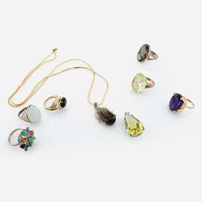 consisting of six gemstone rings and two gemstone pendants, set with quartz, prasiolite, jade, and chalcedony.