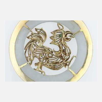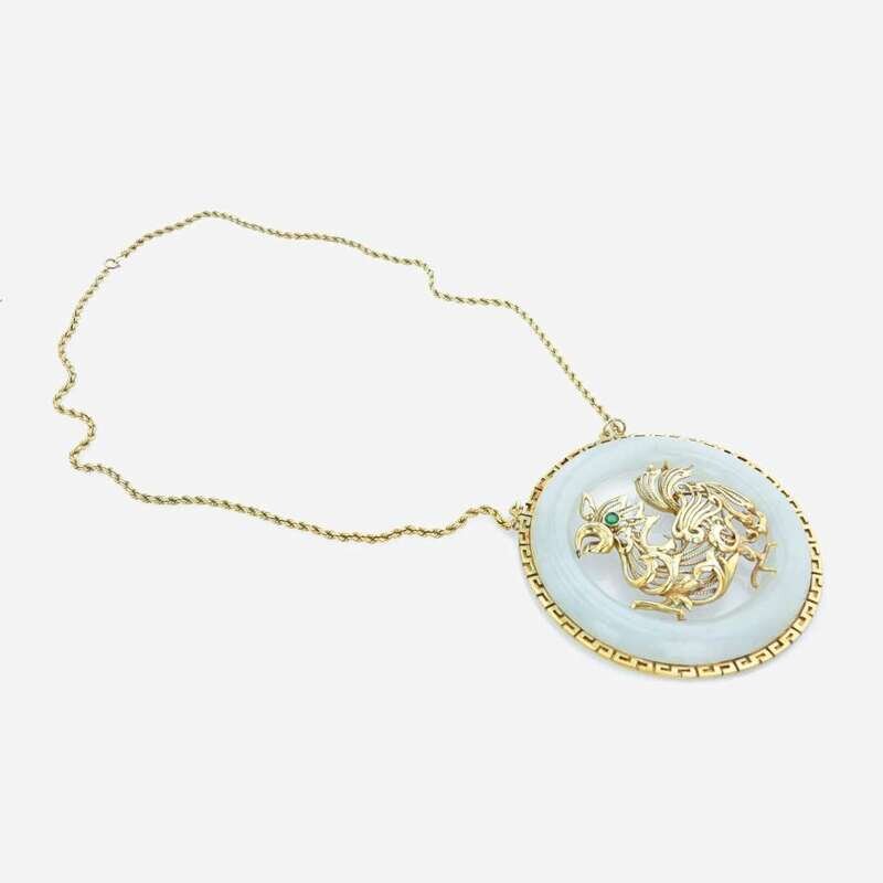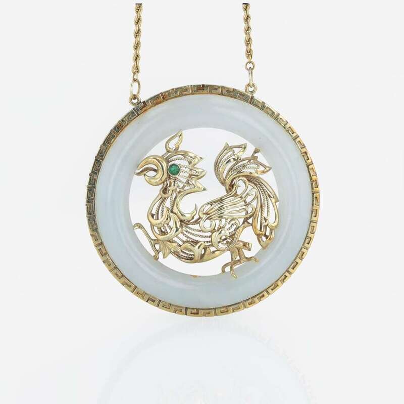 comprised of a 3 1/2 in. circular jade stone, framed by a Greek key fourteen karat yellow gold mounting, centering a large rooster figural cut out set with a circular-cut emerald eye, suspending from a rope chain.