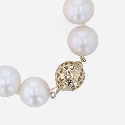 comprised of thirty-three South Sea cultured pearls measuring approximately 11.00 to 15.00mm, strung and knotted on an 18" silk cord, completed a fourteen karat gold diamond accented round clasp.