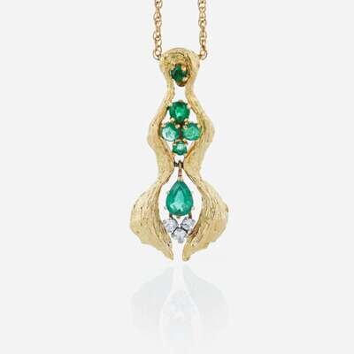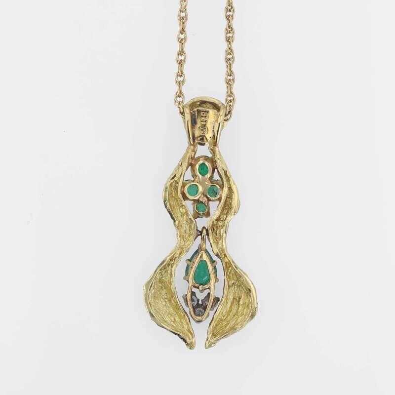 designed as a textured organic-shaped eighteen karat yellow gold pendant set with pear and circular-cut emeralds, accented by three round brilliant-cut diamonds; estimated total diamond weight 0.15 carats.