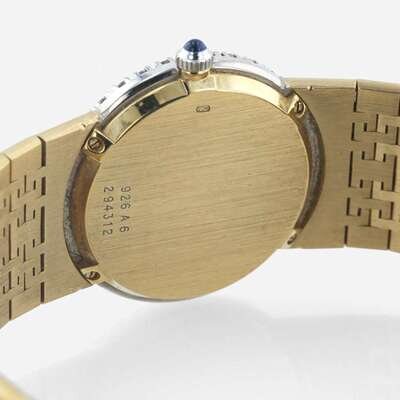 textured integrated bracelet, gold dial with gold stick hour markers. Diamond decorated case, estimated total diamond weight: 0.70 carats.