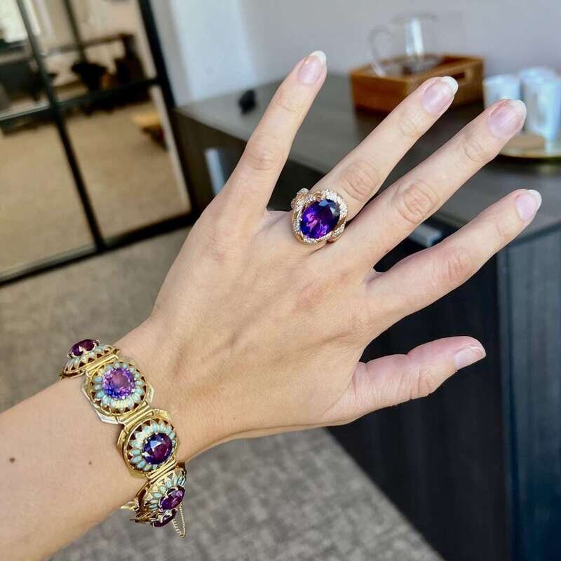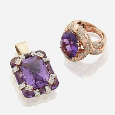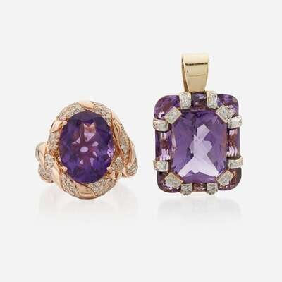 including a ring centering an oval-cut amethyst weighing approximately 6.00 carats, accented by round brilliant-cut diamonds, mounted in 18K rose gold, and a pendant centering a rectangular faceted amethyst weighing approximately 8.00 carats, surrounded by calibré-cut amethysts and pavé-set round brilliant-cut diamonds, mounted in 18K yellow gold.