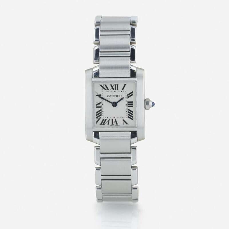 A battery-operated quartz movement, Tank Française watch, small model, octagonal crown set with a synthetic cabochon-shaped spinel, silver-grained dial, blued-steel sword-shaped hands, sapphire crystal, steel bracelet.