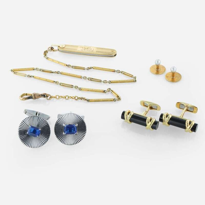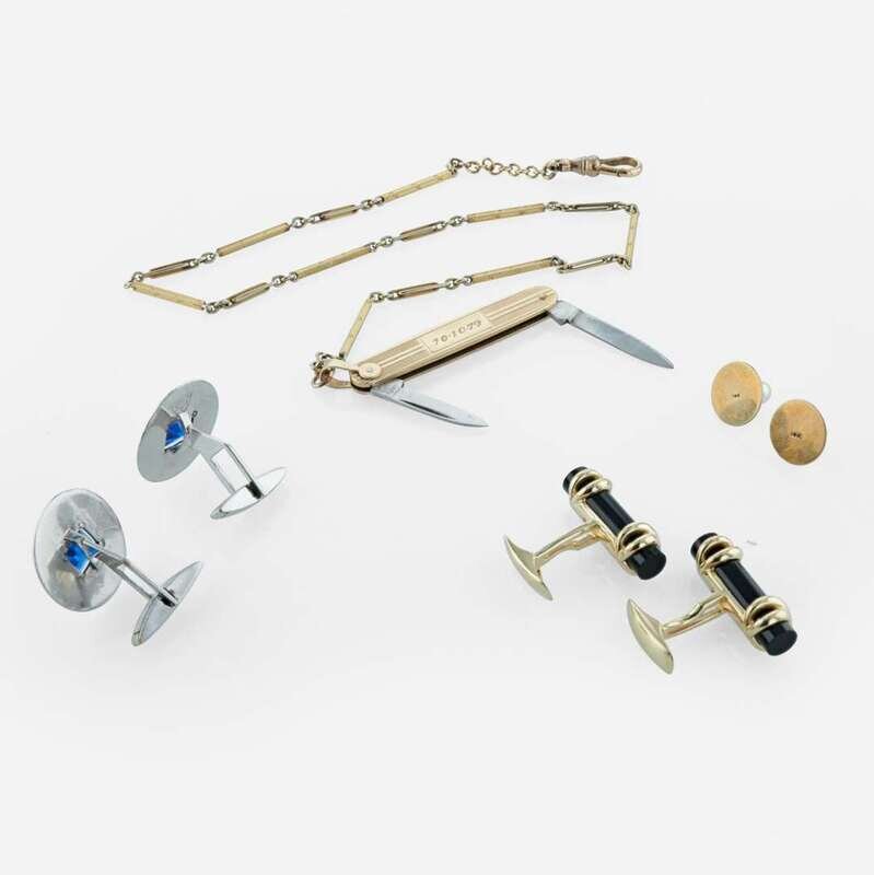 including an engraved pocket knife on a fourteen-karat yellow gold chain; a pair of eighteen-karat white gold and synthetic blue spinel cufflinks; a pair of fourteen-karat yellow gold and black chalcedony cufflinks; and a fourteen-karat yellow gold tuxedo accessory set with a cultured pearl.