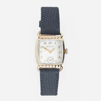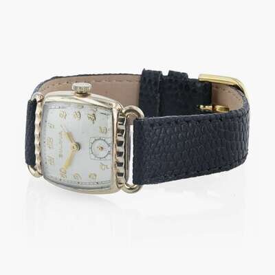 15J unadjusted swiss movement, cased in gold filled case. Silver dial with arabic number markers and seconds subdial. 16 XL lizzard embossed leather strap with a gold tone clasp. Arabic number dial, with gold hands.