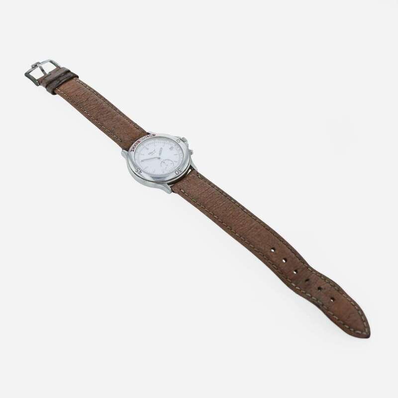 A quartz battery-operated movement in a stainless steel case and leather strap bracelet. White dial with silver stick markers, seconds subdial, and date at 3o clock.
