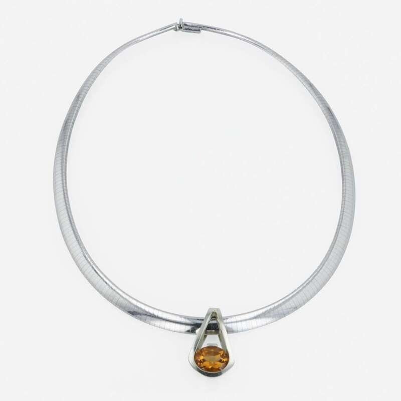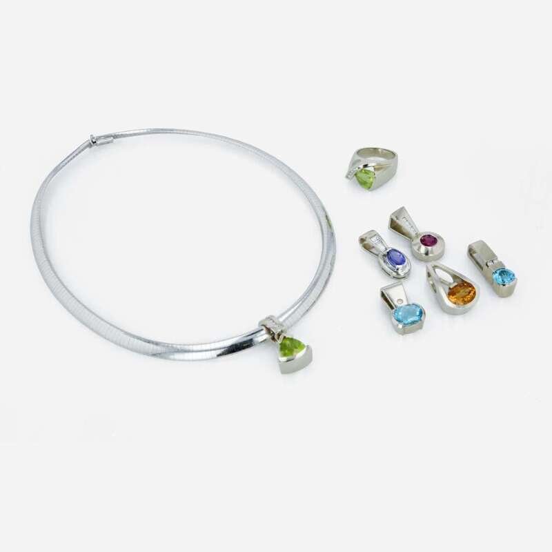 including a fourteen karat white gold omega necklace with six interchangable pendants set with a circular-cut blue topaz, an oval-cut blue topaz, a circular-cut pink tourmaline, an oval-cut tanzanite, an oval-cut citrine, and a triangular-cut peridot, most accented with round brilliant and straight baguette-cut diamonds; together with a triangular-cut peridot and round brilliant-cut diamond ring.