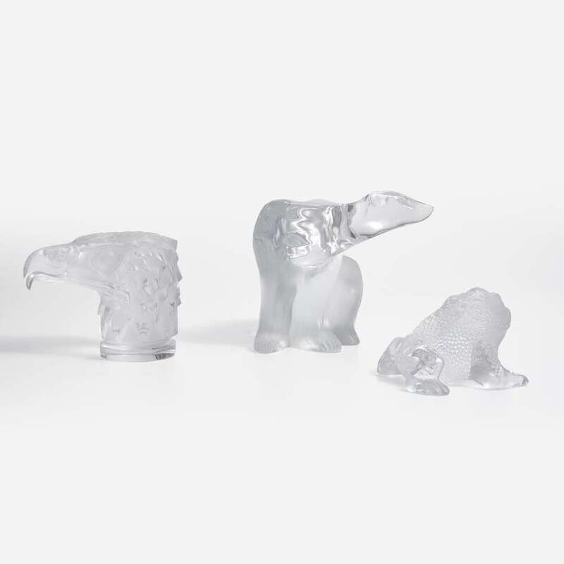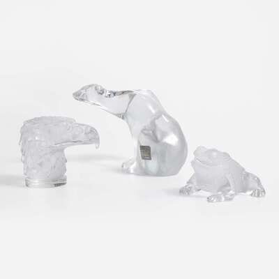 A Lalique Tête d'Aigle car mascot figure, designed 1928 by René Lalique. Together with a Gregoire toad figure, designed 1973 by Marc Lalique, and an "Ours" polar bear figure, no. 11637.
