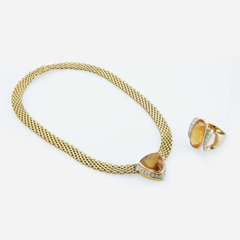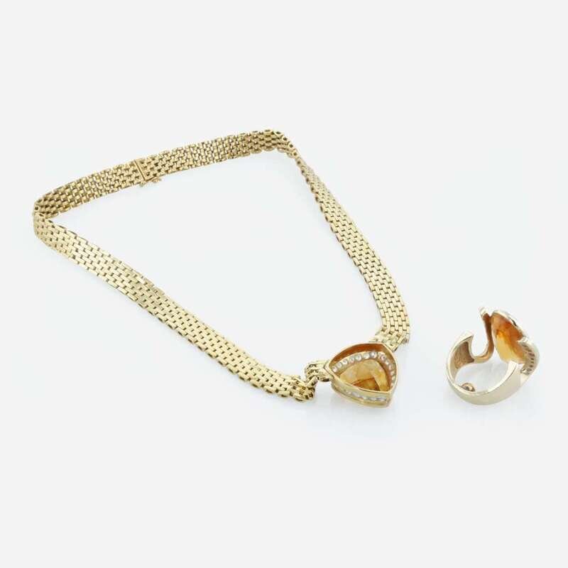a panther-style link necklace centering a triangular-cut bezel-set citrine measuring approximately 18.00 x 16.00mm, framed by twenty-four round brilliant-cut diamonds; together with and oval-cut yellow topaz measuring approximately 23.00 x 13.00mm, accented by graduating diamonds.
