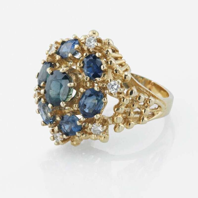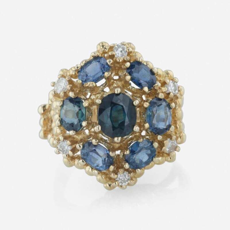 designed as a cluster, centered by a 5.4 X 6.8mm sapphire surrounded by six oval sapphires and six round brilliant cut diamonds, with an estimated total diamond weight of 0.36 carats.