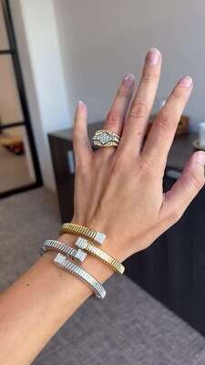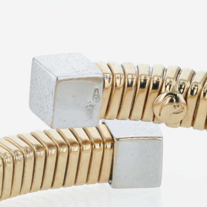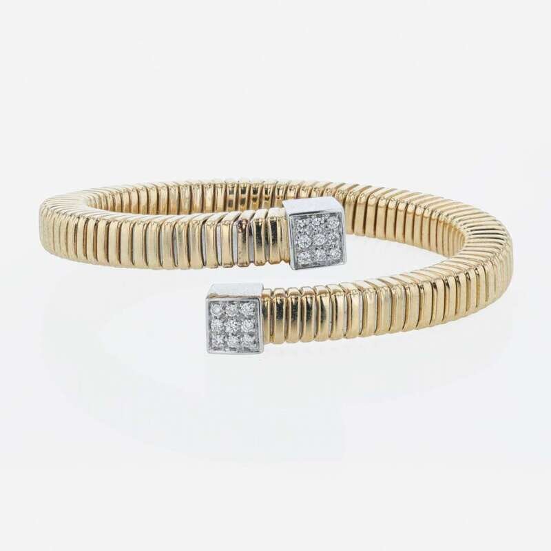 designed as a ribbed eighteen karat yellow gold cuff bracelet terminating in white gold set with round brilliant-cut diamonds.