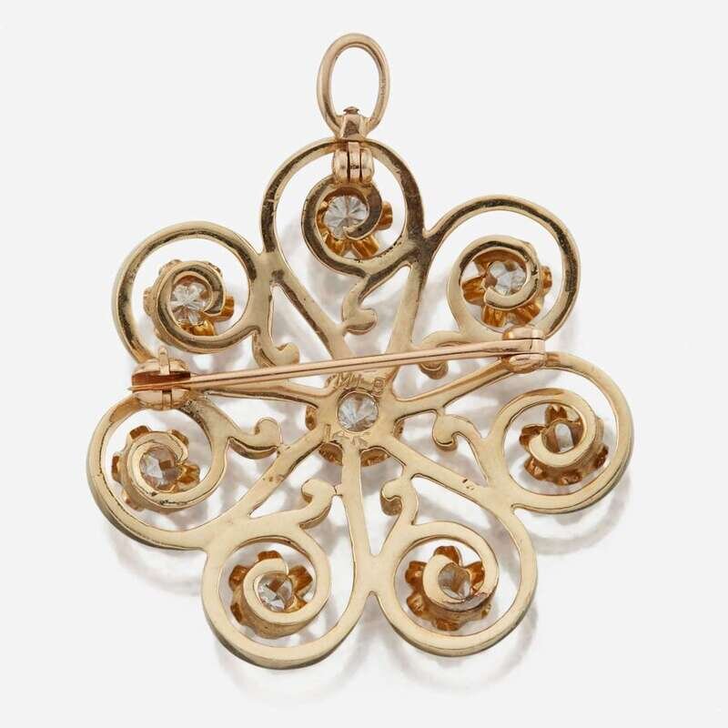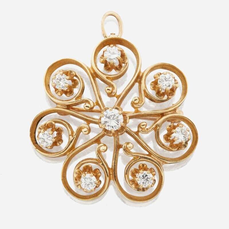 the openwork fourteen karat yellow gold design set with round brilliant-cut diamonds; estimated total diamond weight: 0.95 carats.