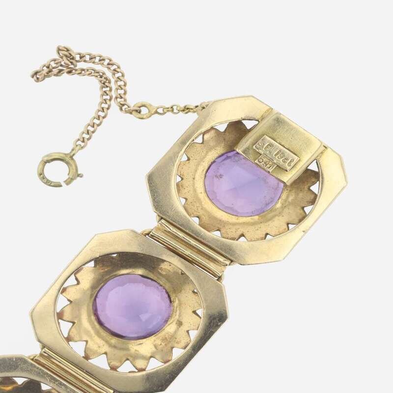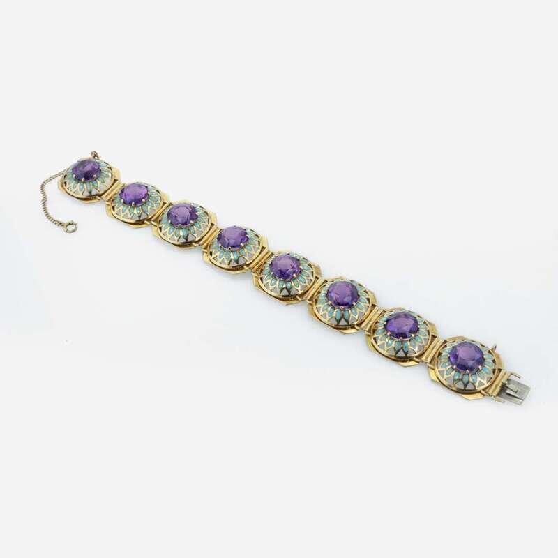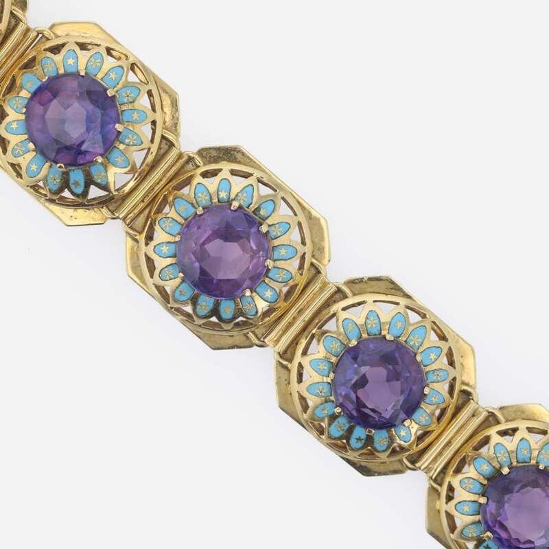 designed as eighteen karat gold octagonal links, each set with a circular-cut synthetic purple sapphire measuring approximately 11.00mm in diameter, with blue enamel accents.