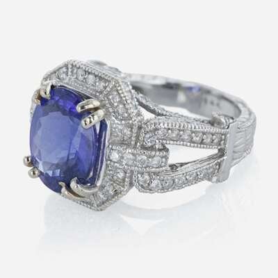 A 14K white gold, tanzanite, and diamond ring