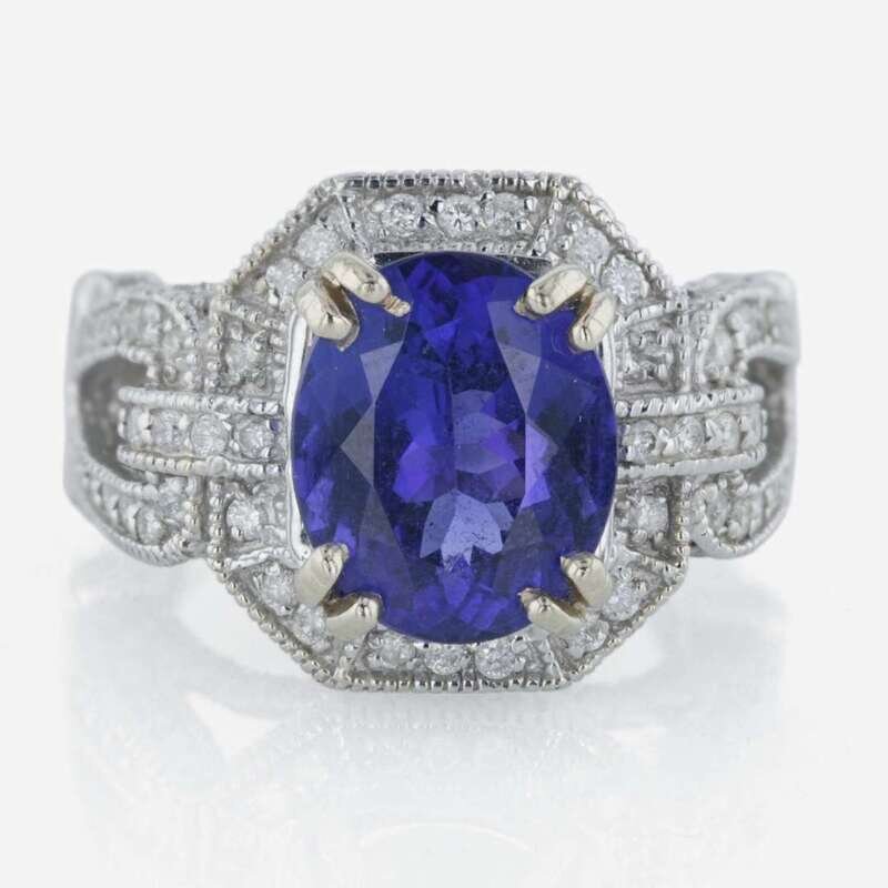 centering an oval-cut tanzanite measuring approximately 12.03 x 9.98mm, accented by round brilliant-cut diamonds around the shank and the undercarriage; estimated total diamond weight: 2.4 carats, mounted in fourteen karat white gold.