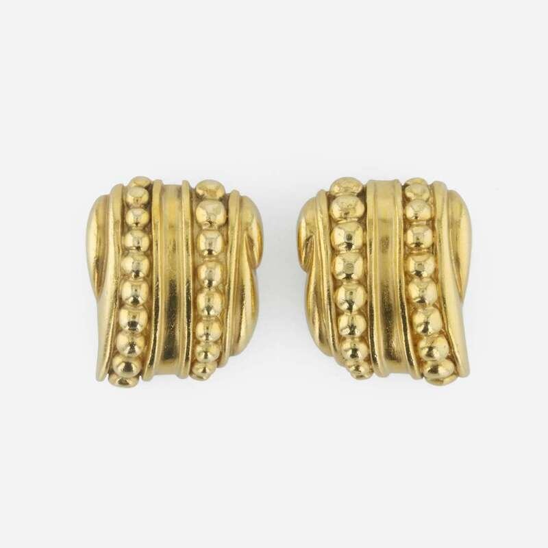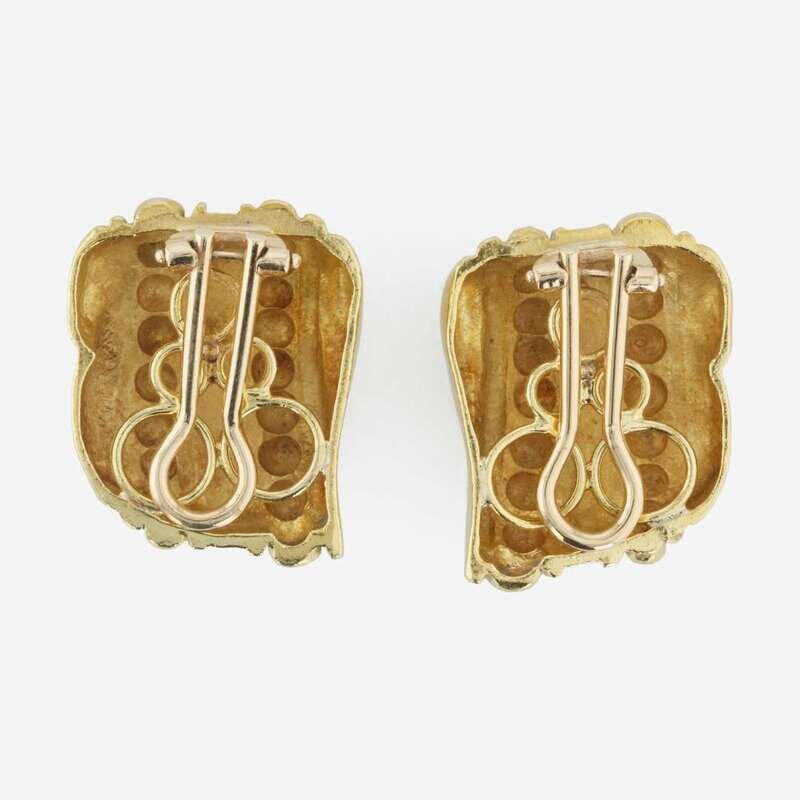designed as sculpted and textured eighteen karat gold ear clips for non-pierced ears.