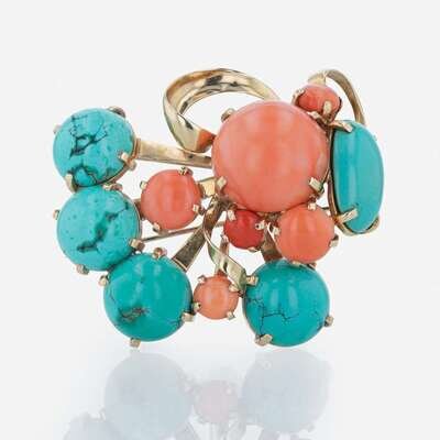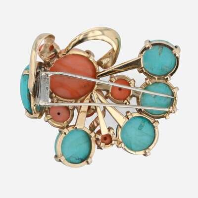 A 14K yellow gold, coral, and turquoise brooch Attrib: Seaman Schepps
