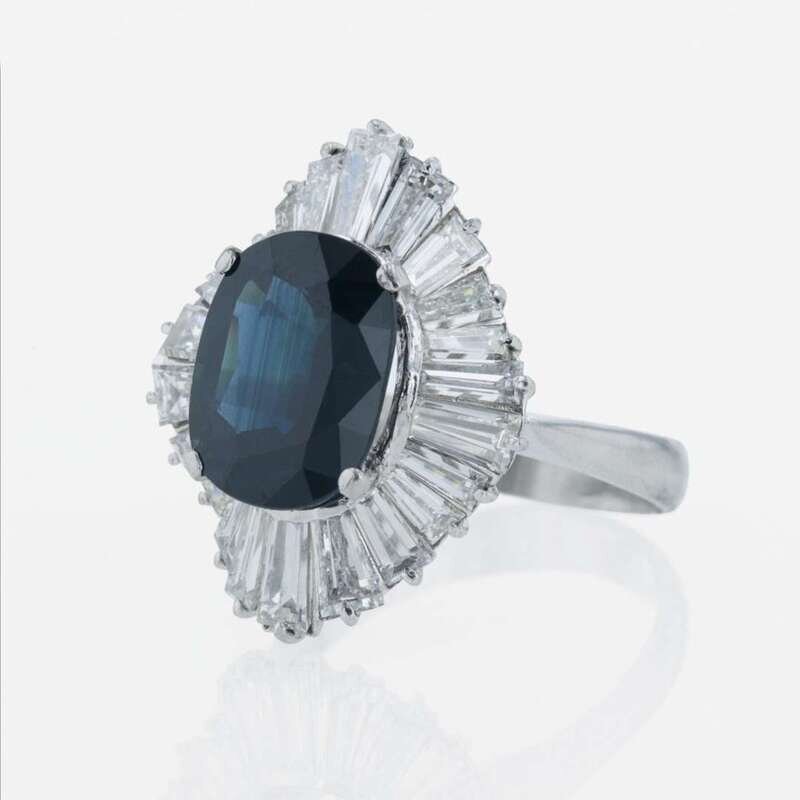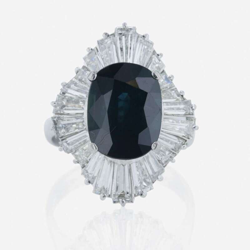 a ballerina-style setting, centering a cushion-cut sapphire measuring approximately 12.10 x 9.22 x 5.04mm, surrounded by twenty-two baguette diamonds; estimated total diamond weight: 3.40 carats.