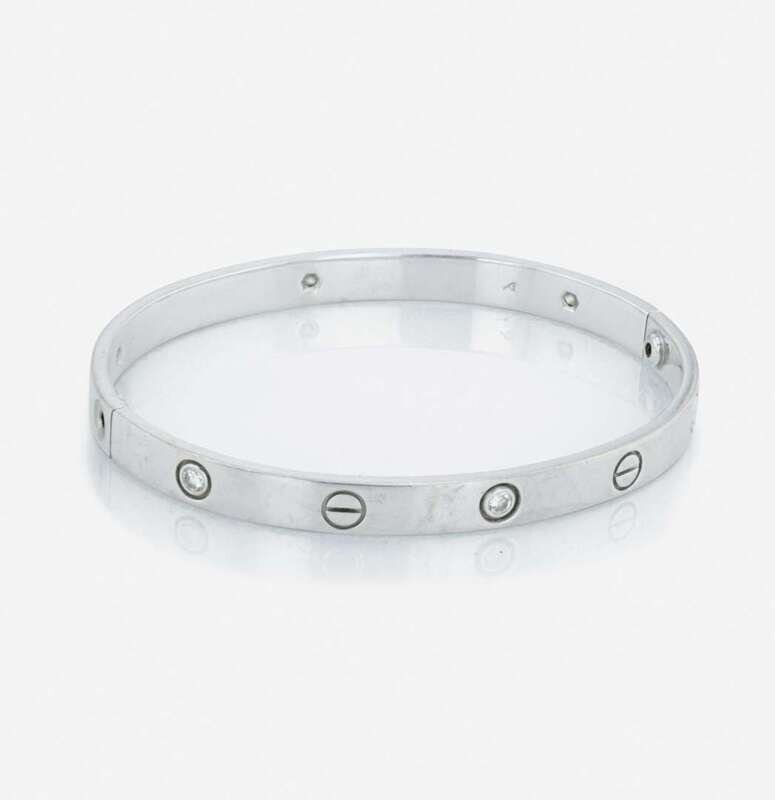 an iconic eighteen karat white gold love bracelet set with six round brilliant-cut diamonds; estimated total diamond weight: 0.40 carat.