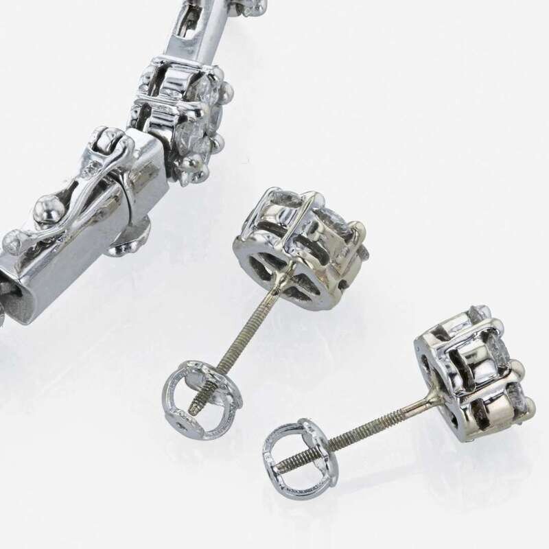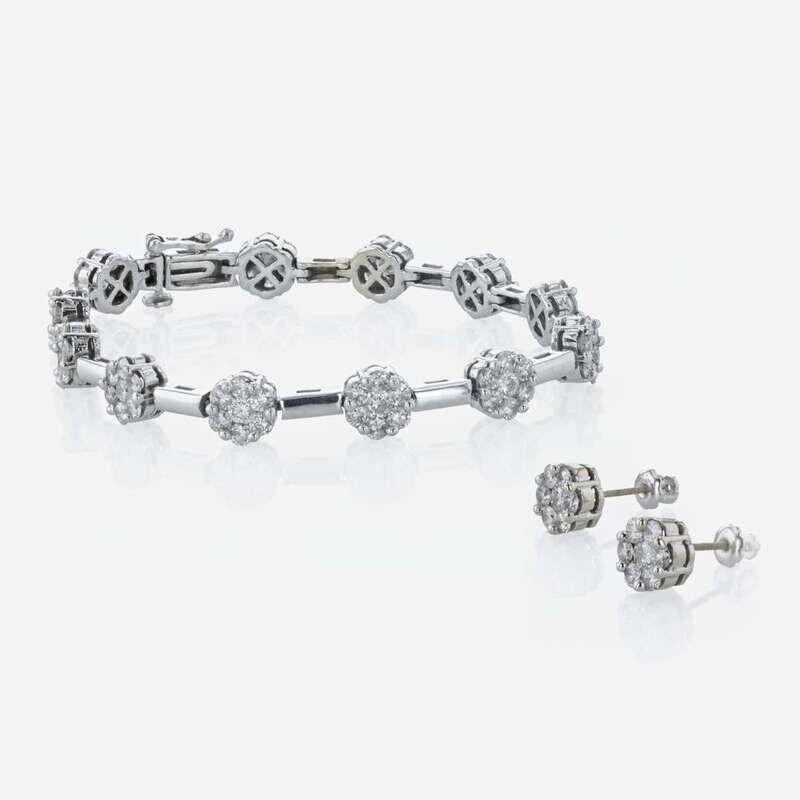 a fourteen-karat white gold cluster and polished link bracelet, together with a matching pair of screwback earring studs, estimated total diamond weight of 4.80 carats.