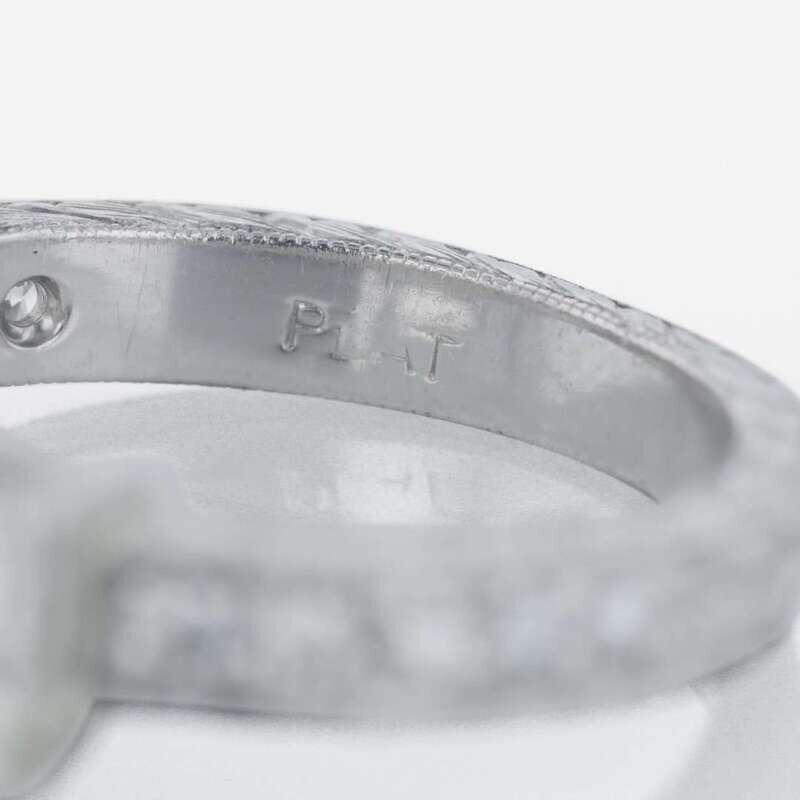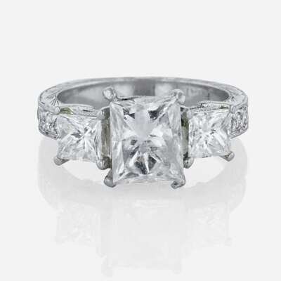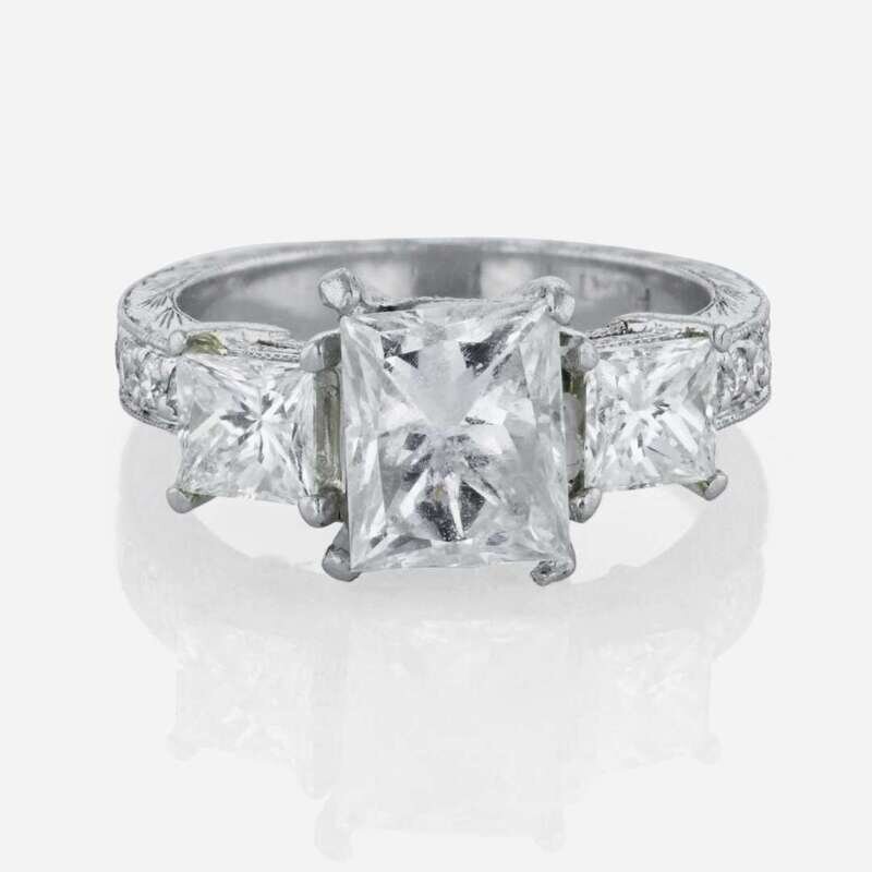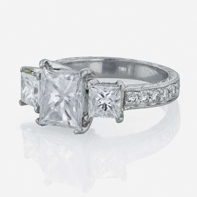 designed as a three-stone ring in Art Deco-style hand engraved mount, centering a princess-cut diamond weighing approximately 1.75 carats, flanked by princess-cut diamonds weighing approximately 0.35 carat each, further set with round brilliant-cut diamonds. 0.39ct princesses cut diamonds and ten additional diamonds round brilliant-cut diamonds. Set in an art deco-style hand-engraved ring.