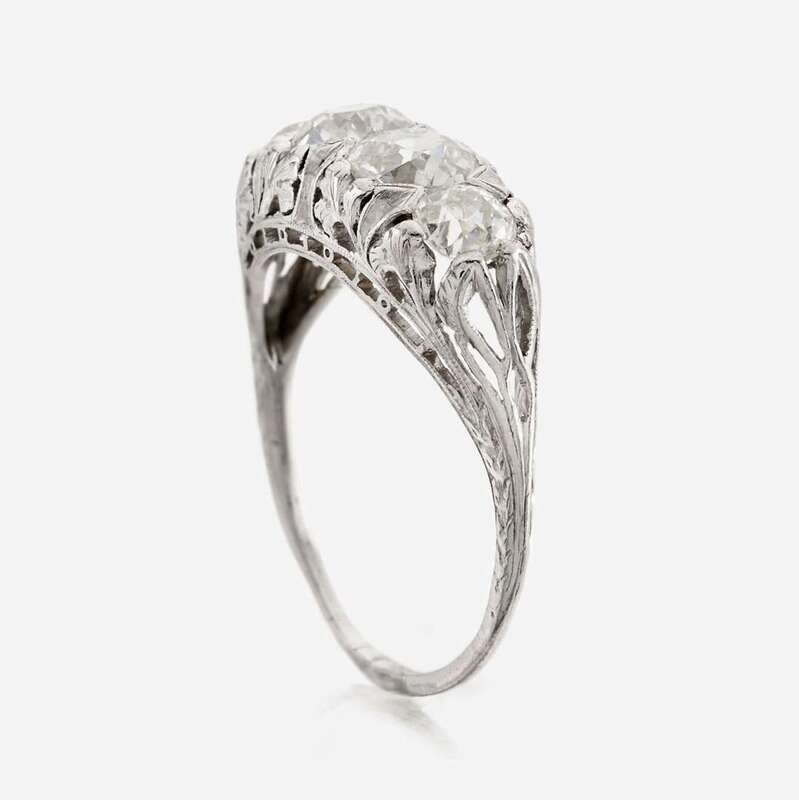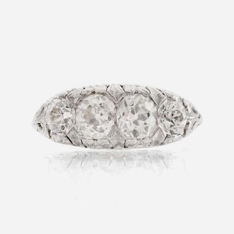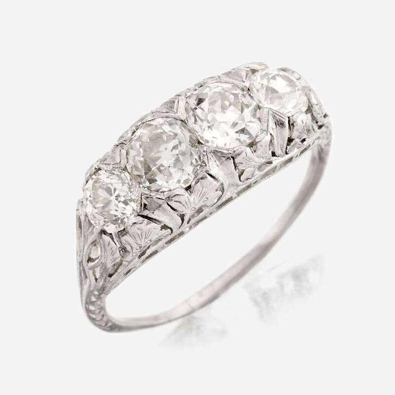 set with four old European-cut diamonds weighing approximately 0.80, 0.75, 0.45, and 0.45 carat each, mounted in pierced and etched platinum with a floral motif.