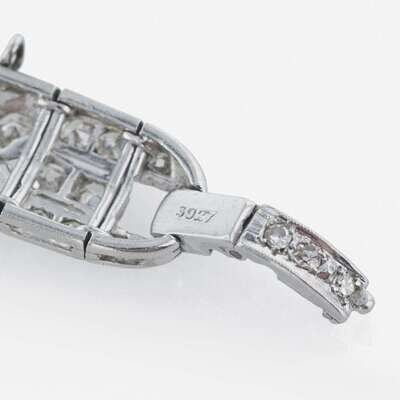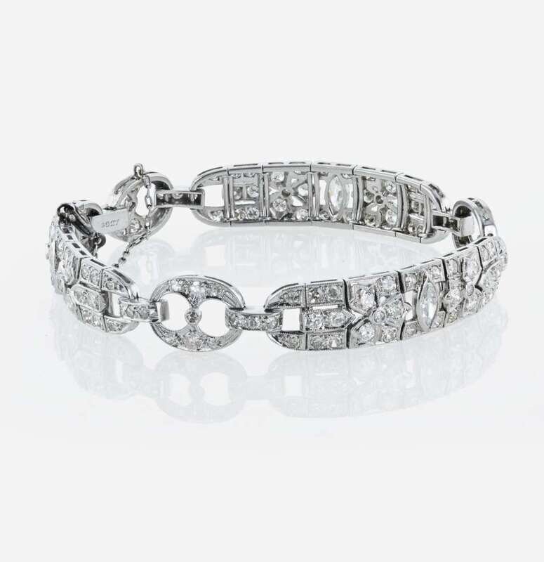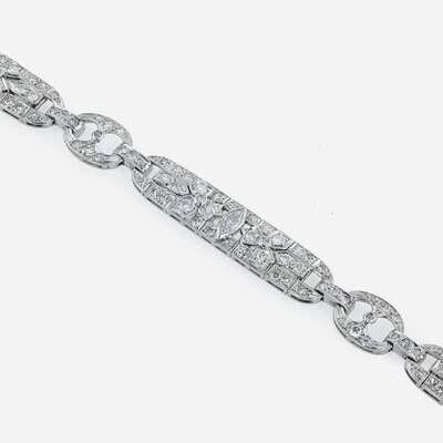 designed as a line of round and marquise cut diamonds accented by double oval diamond loops; estimated total diamond weight of 5.34 carats