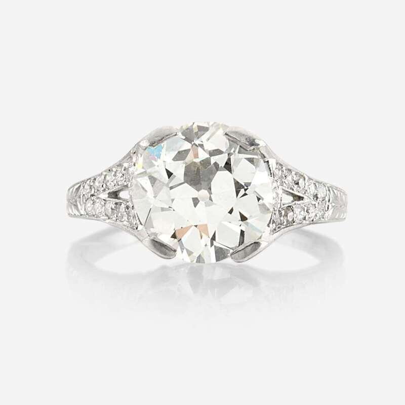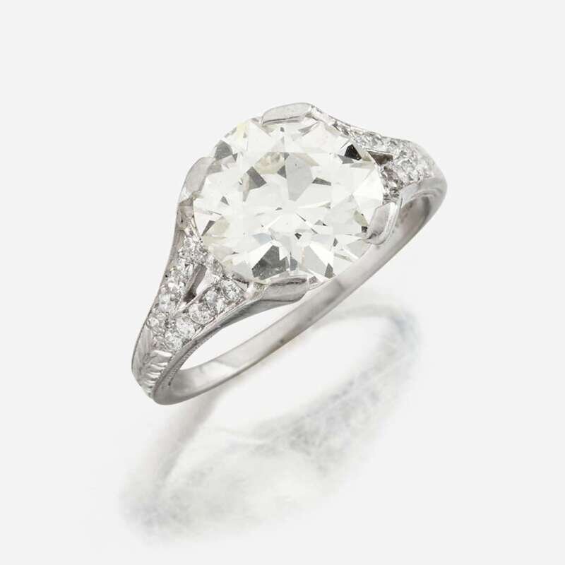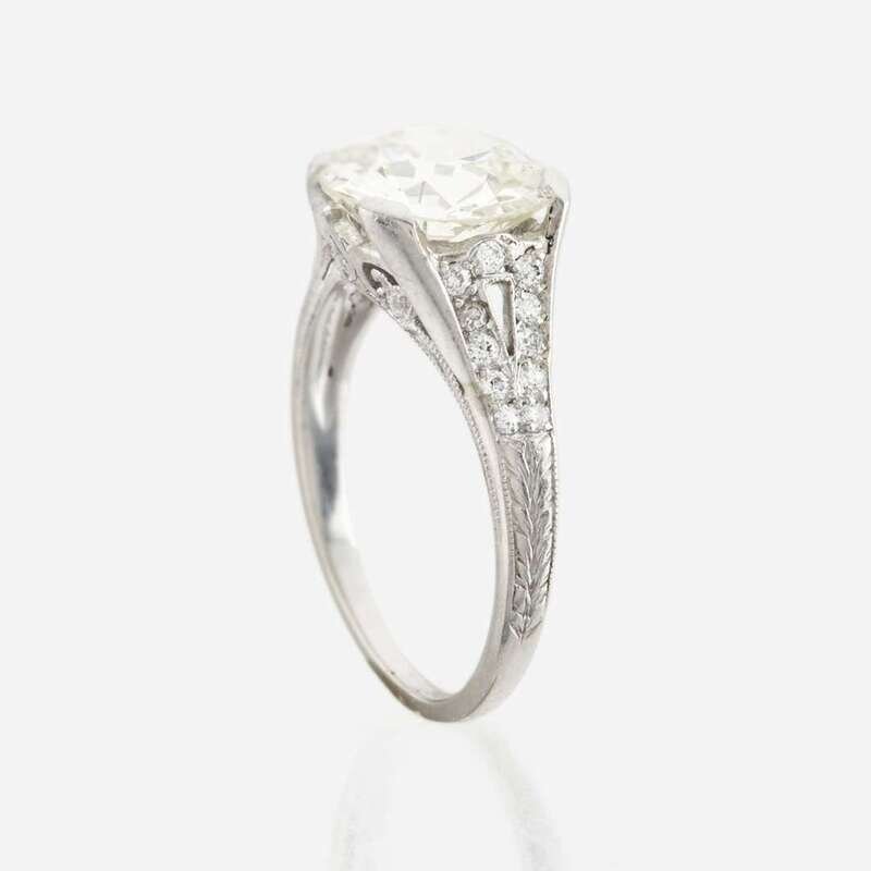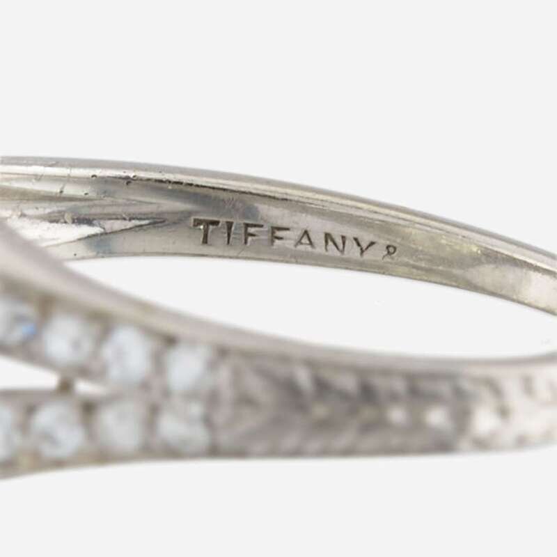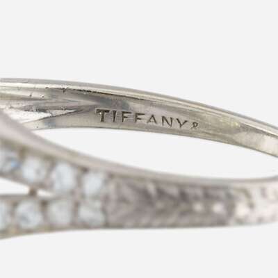 centering an old European-cut diamond weighing approximately 2.60 carats, accented by old European-cut diamonds, mounted in platinum. Stamped Tiffany & Co.
