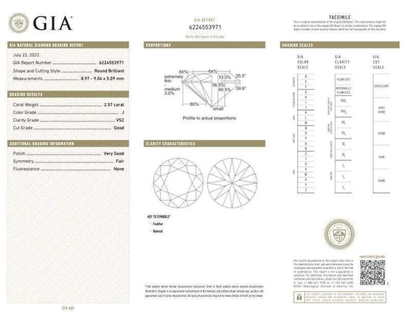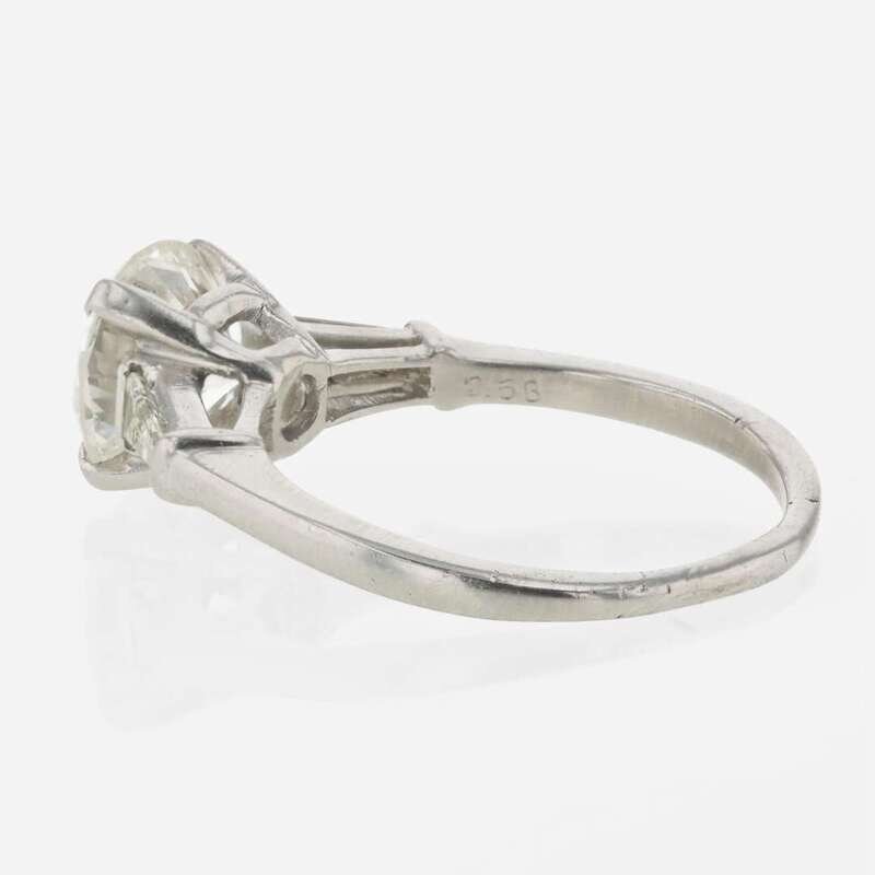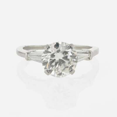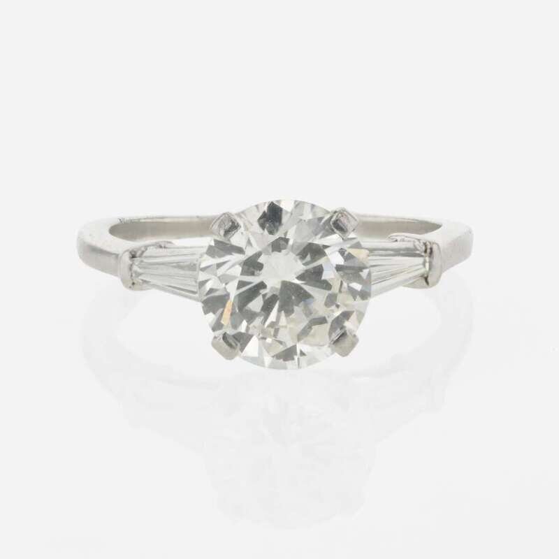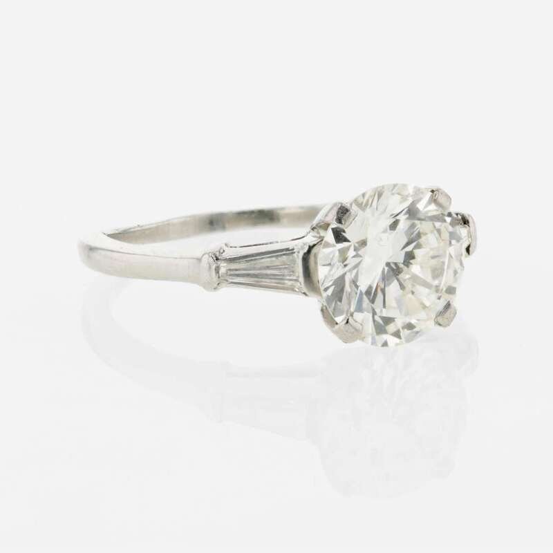 centering a round brilliant cut diamond weighing 2.57 carats, flanked by baguette-cut diamond shoulders, mounted in platinum.