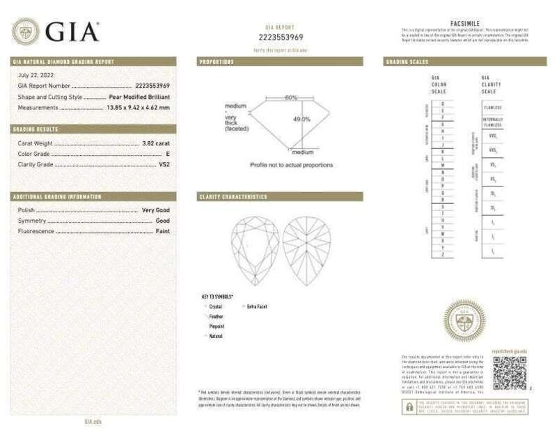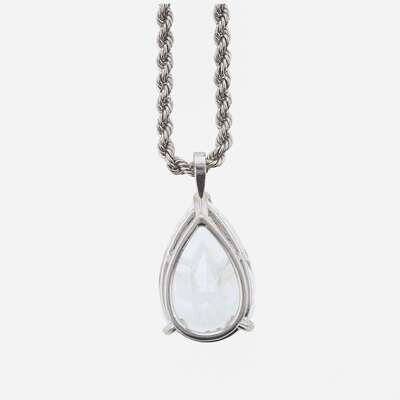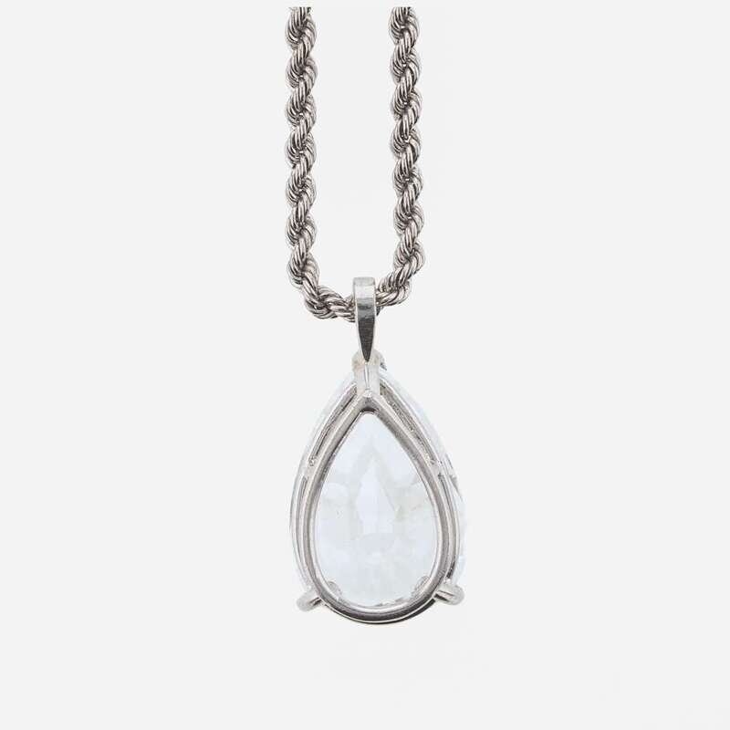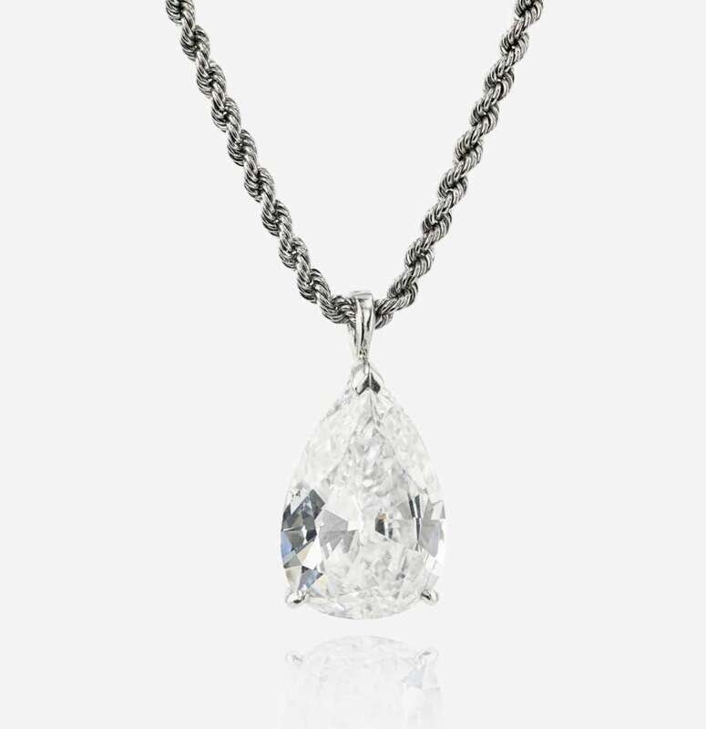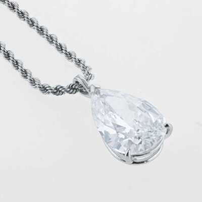 Centering a brilliant pear cut diamond weighing 3.82 carats, set in a platinum basket setting, suspending from a platinum rope chain.