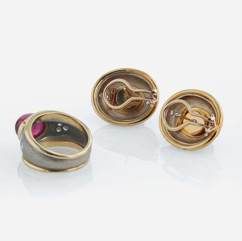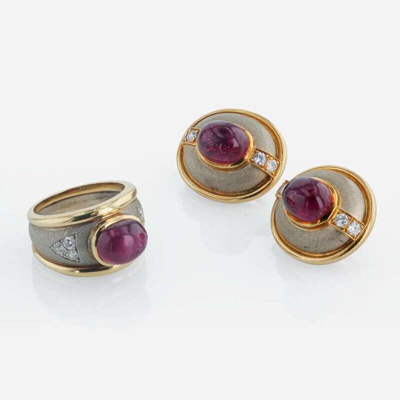 designed as a set of oval-shaped bicolor, eighteen-karat polished yellow gold, and sandblasted white gold earrings, together with a matching ring centering a 10x8mm oval cabochon rubelite tourmaline, flanked by round brilliant-cut diamonds with an estimated total weight of 0.90 carats.