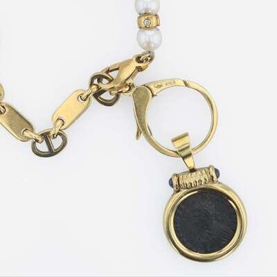 comprised of sixty-eight 6.00mm cultured pearls knotted and strung together with eighteen karat gold chain, diamond set rondels, decorative large trigger clasp, and removable 3/4 in. coin pendant in a gold bezel.