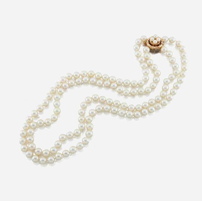 designed as a double strand of cultured pearls measuring approximately 8.00mm, completed by a 14K gold clasp set with round brilliant-cut diamonds and cultured pearls measuring approximately 5.00mm.