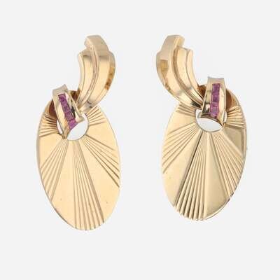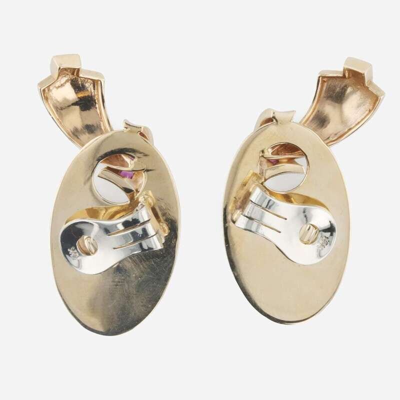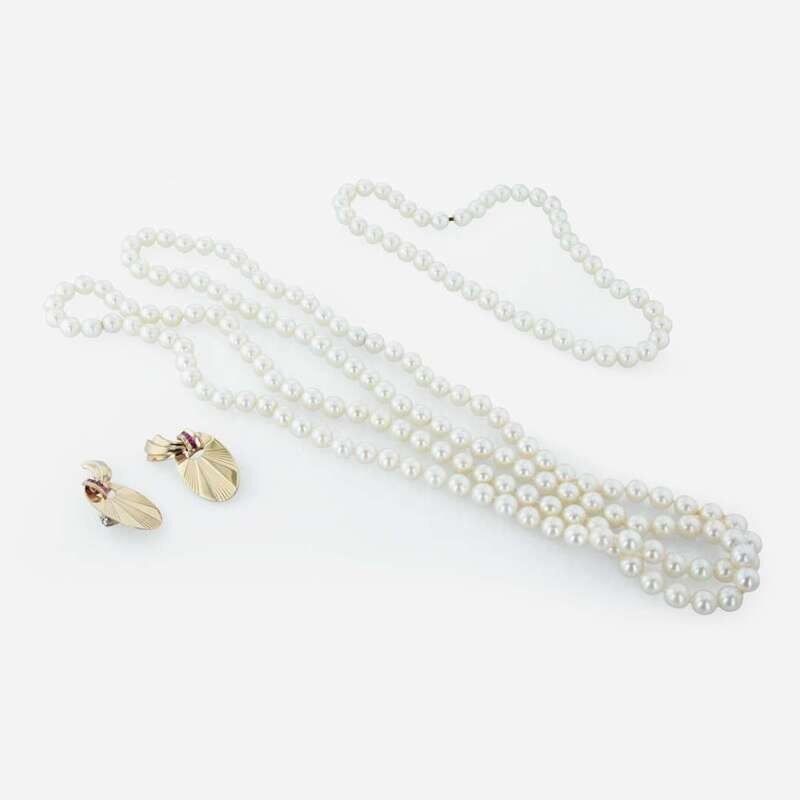 A pair of fourteen karat yellow retro gold ear clips set with square cut rubies together with two cultured pearl strands, one 48-in.8-8.4mm pearl strand, and a 15-in pearl strand that can be worn together for a combined length of 63 inches.