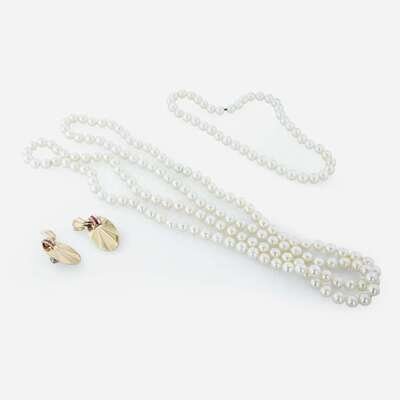 Earrings; 1 1/2 in. Pearls, 48 in and 15 in. Weight: 105.8 gross dwt.