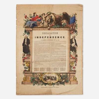 "The American eagle, a portrait of Washington, and the figure of Liberty occupy the pediment of the frame. The state seals run along the frieze at the top and along the bottom edge. Franklin and Jefferson stand at either side, and a reproduction of Trumbull's Declaration is set within a cartouche at the bottom, symbols of peace and prosperity to the left, the implements of war to the right." (John Bidwell, American History in Image and Text, 1989).