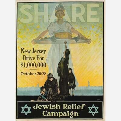 "Centered on a large headline spelling Share, the figure of America serves a bountiful meal to four needy European Jews. This stunning, well-designed poster represents the best in poster art. The relationship between the few words of strong text and the vivid, compelling imagery is especially coherent. The economy of both text and image creates a succinct and lasting message. Although no documentation is available on the Jewish Relief Campaign, it was probably part of the Jewish Relief Committee, one of three organizations that joined together in 1914 to form the American Jewish Joint Distribution Committee in response to the devastation of European Jewry during World War I..." (Helzel, Florence B., and Eileen Battat, Witness to History, The Jewish Poster 1770-1985, A Selection from the Judah L. Magnes Museum, pp. 35).