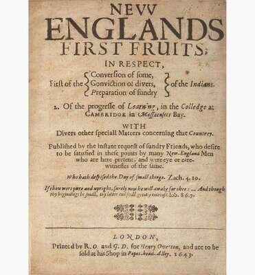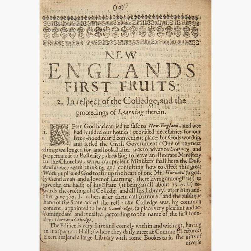 This tract, one of the rarest of the 11, is also notable for featuring the first printed account of Harvard College, founded only seven years prior to this publication: "After God had carried us safe to New-England, and wee had builded our houses, provided necessaries for our liveli-hood, rear'd convenient places for Gods worship, and setled the Civill Government: One of the next things we longed for and looked after was to advance Learning and perpetuate it to Posterity; dreading to leave an illiterate Ministery to the Churches...it pleased God to stir up the heart of one Mr. Harvard (a godly Gentleman, and a lover of Learning, there living amongst us) to give the one halfe of his Estate...towards the erecting of a Colledge, and all his Library...the Colledge was, by common consent, appointed to be at Cambridge...and is called...Harvard Colledge." (p. 12).