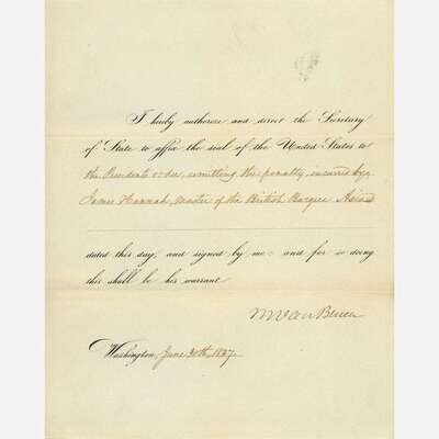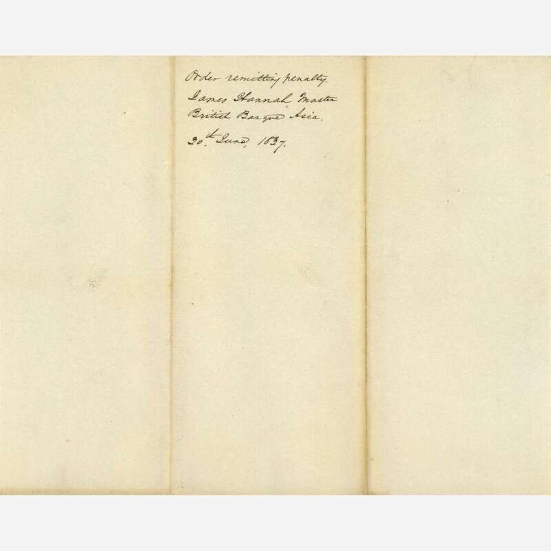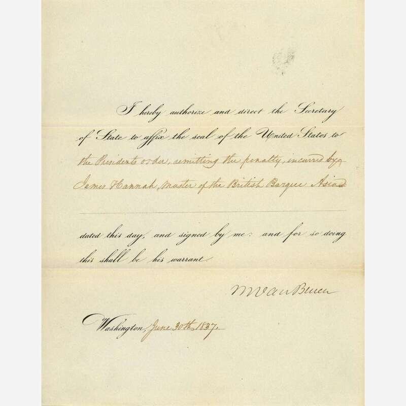 Washington, (D.C.), June 30, 1837. One sheet folded to make four pages, 10 x 8 1/4 in. (254 x 209 mm). Printed presidential order, signed by Van Buren, directing "the Secretary of State," John Forsyth, "to affix the seal of the United States to the Presidents order, remitting the penalty, incurred by James Hannah, Master of the British Barque Asia;" docketed on verso; creasing from contemporary folds.