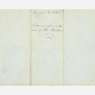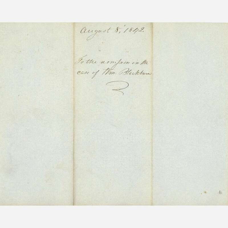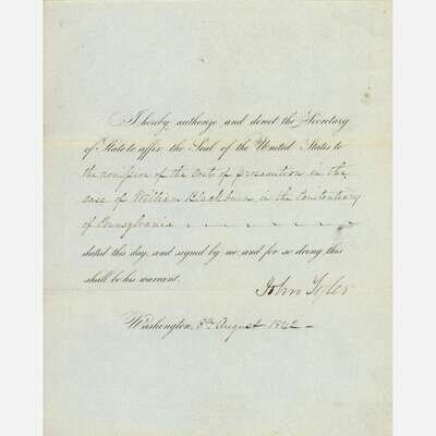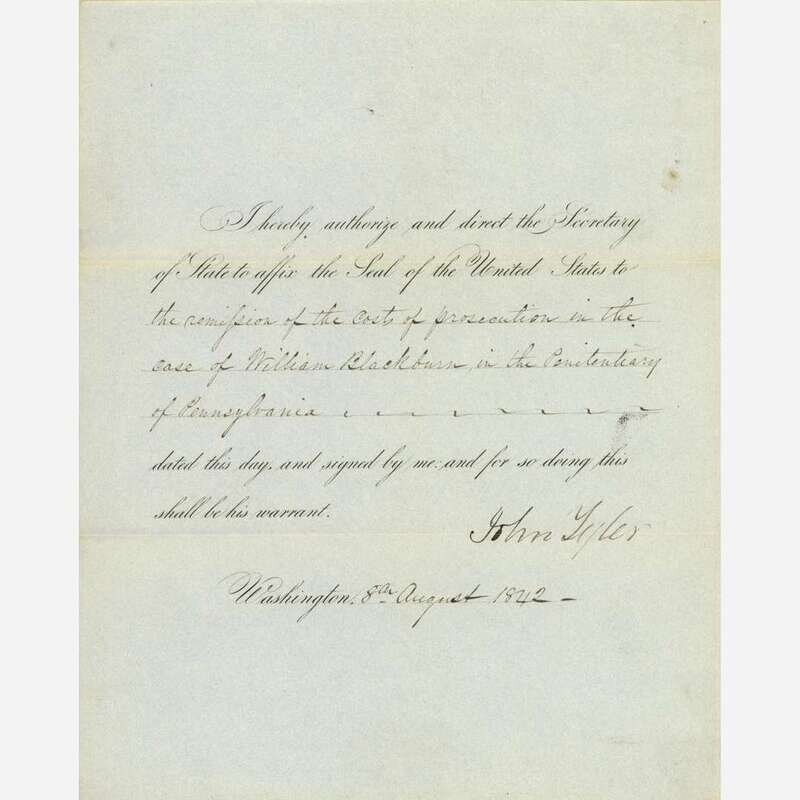 Washington, (D.C.), August 8, 1842. One sheet folded to make four pages, 10 x 8 1/4 in. (254 x 209 mm). Printed presidential order, signed by Tyler, directing "the Secretary of State," Daniel Webster, "to affix the Seal of the United States to the remission of the costs of prosecution in the case of William Blackburn, in the Penitentiary of Pennsylvania;" docketed on verso; creasing from contemporary folds.