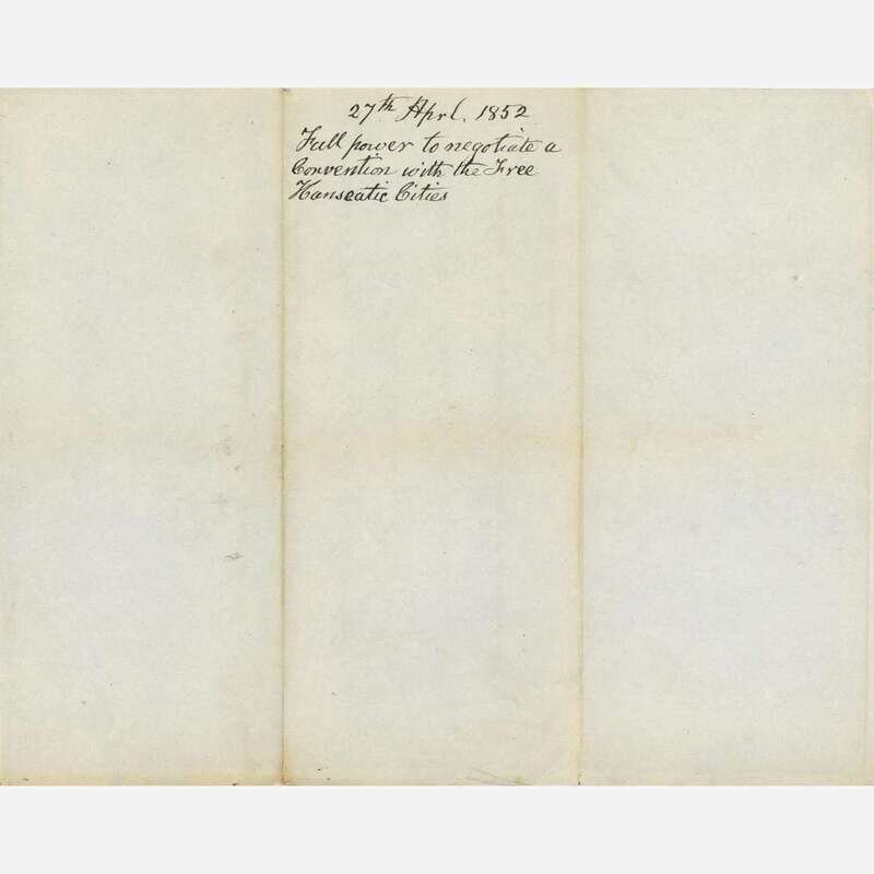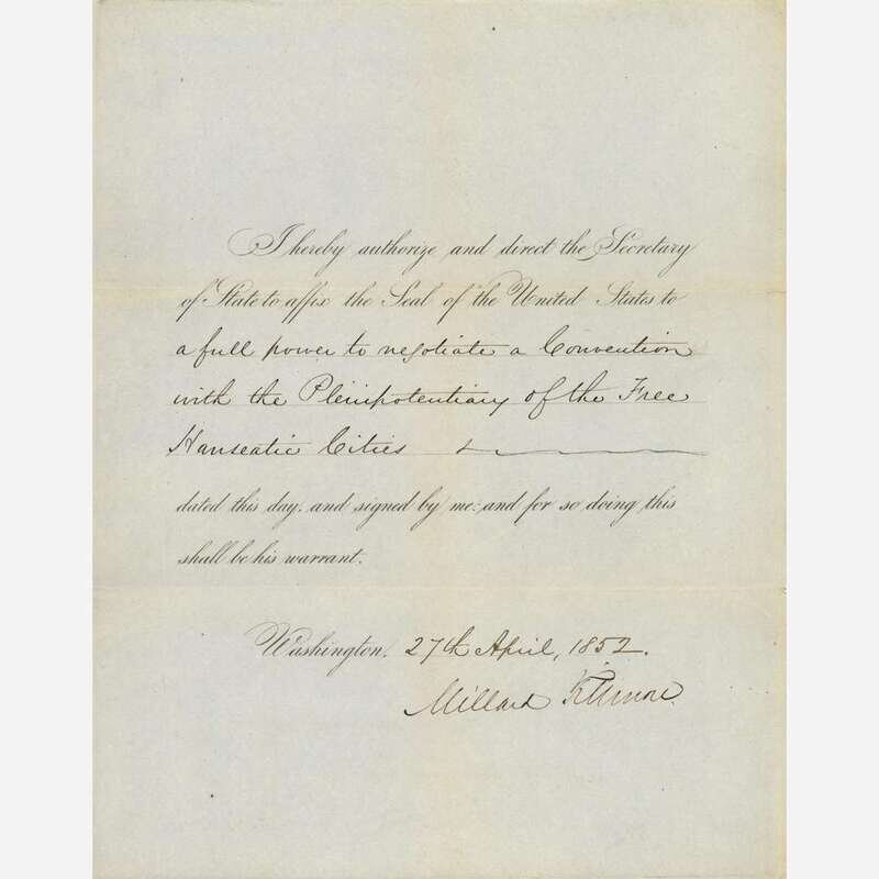 Washington, (D.C.), April 27, 1852. One sheet folded to make four pages, 10 x 8 1/4 in. (254 x 209 mm). Printed presidential order, signed by Fillmore, directing "the Secretary of State," Daniel Webster, "to affix the Seal of the United States to a full power to negotiate a Convention with the Plenipotentiary of the Free Hanseatic Cities;" docketing on verso; creasing from contemporary folds.