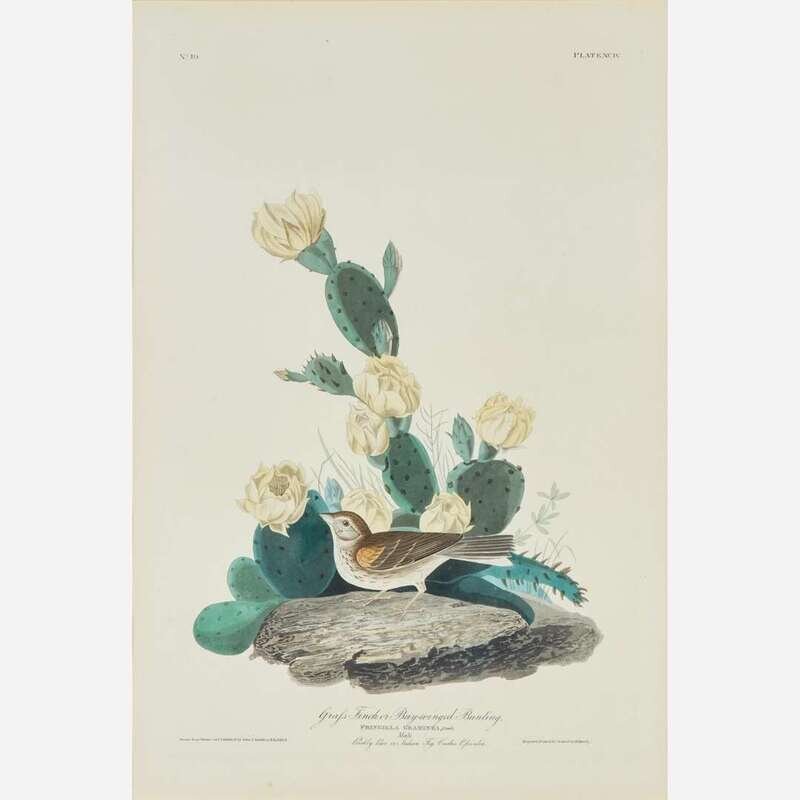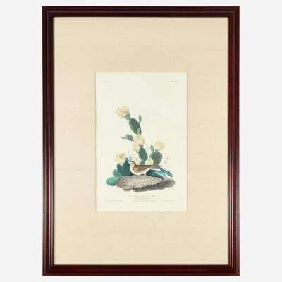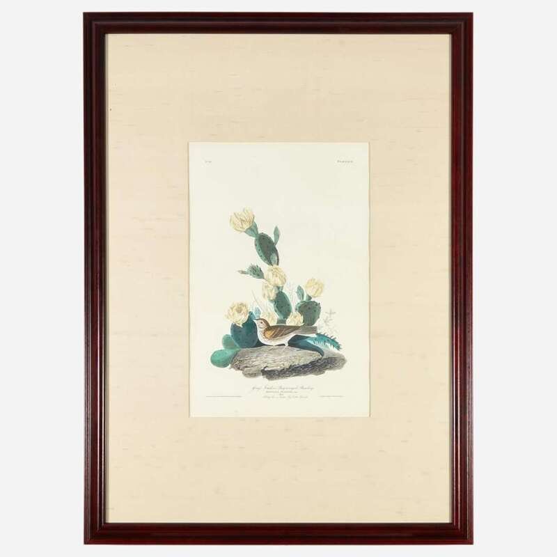 London: R. Havell, (1836). Hand-colored engraving with aquatint and etching, on J. Whatman watermarked paper, dated 1836. Engraved, printed, and colored by R. Havell after J.J. Audubon’s watercolor. 38 1/8 x 25 5/8 in. (97 x 65 cm). Sheet lightly toned; light mat burn along outer plate mark; hand-coloring somewhat faded; wear along left edge, three short closed tears to same; short closed tear, bottom left edge, other scattered minor edge wear; soiling and spotting in margins. In mat and in frame, 41 3/4 x 30 1/4 in. (106 x 77 cm). Low, p. 82-83