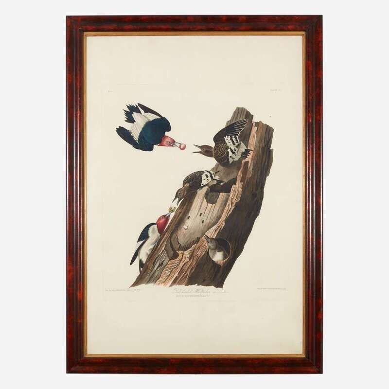 London: R. Havell, (1827). Hand-colored engraving with aquatint and etching, on J. Whatman Turkey Mill watermarked paper, dated 1827. Engraved, Printed, & Coloured by R. Havell & Son, after J.J. Audubon’s watercolor. 37 3/4 x 25 7/8 in. (96 x 66 cm). Sheet slightly trimmed; chipping and repairs in bottom right corner, and top left corner, other scattered light edge-wear; vertical crease traversing center of sheet; spot in image, top right; scattered light soiling in margins. In frame, 42 x 30 in. (107 x 76 cm). Low, p. 44, Variant No. 1