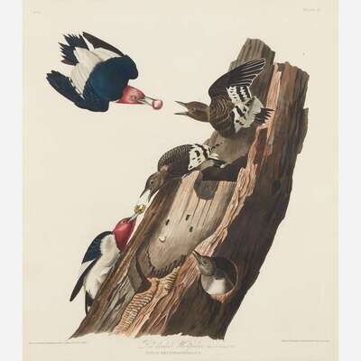 Plate 27 from Audubon's The Birds of America (London, 1827-38). "Painting and plate depict two parents feeding three young, two of whom are clinging to a dead tree trunk, and the third peeking out of a nesting hole. There is no evidence as to where or when the painting was made." (Susanne M. Low, A Guide to Audubon's Birds of America, p. 44)