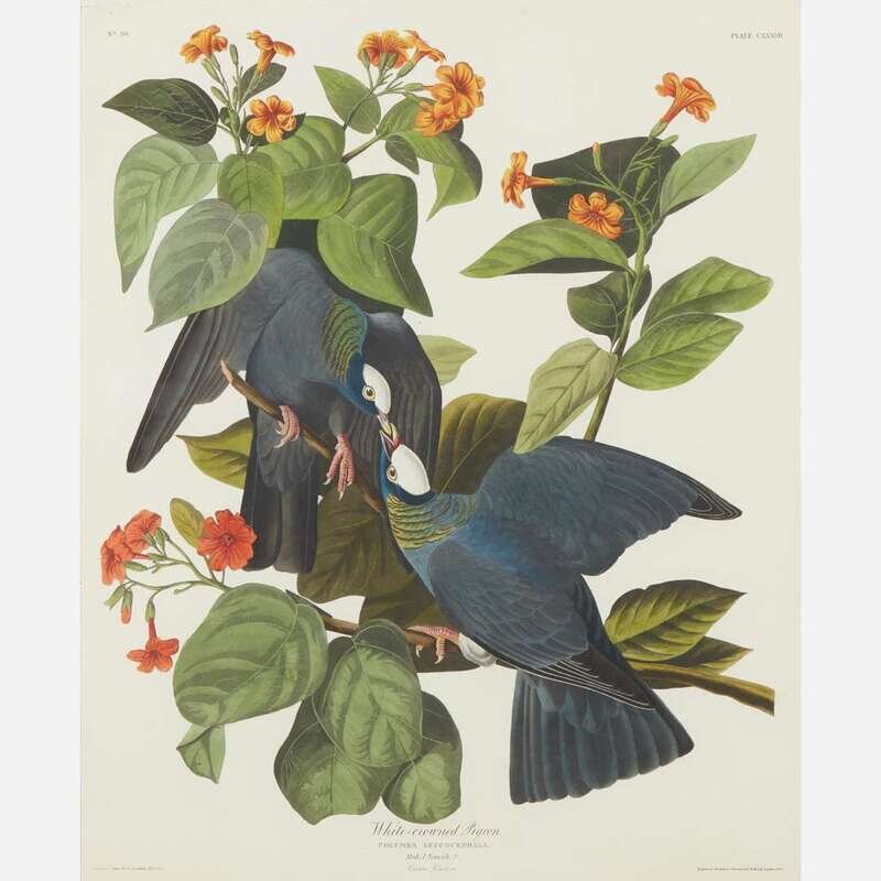 Plate CLXXVII from Audubon's The Birds of America (London, 1827-38). "Painting and plate depict a pair of White-crowned Pigeons in a branch of a Geiger-tree. Audubon painted these birds in Indian Key, Florida, in April, 1832." (Susanne M. Low, A Guide to Audubon's Birds of America, p. 113)